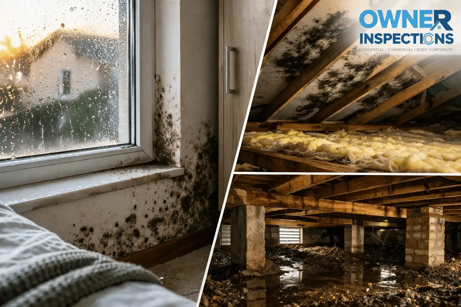 Hidden moisture often builds up in roof voids, subfloors, wall cavities, window reveals, wardrobes and under carpets. These are the parts of a home where airflow is weaker and dampness can sit unnoticed. Australian guidance also notes that mould may be hidden behind walls or under carpets even when there is little to see on the surface.